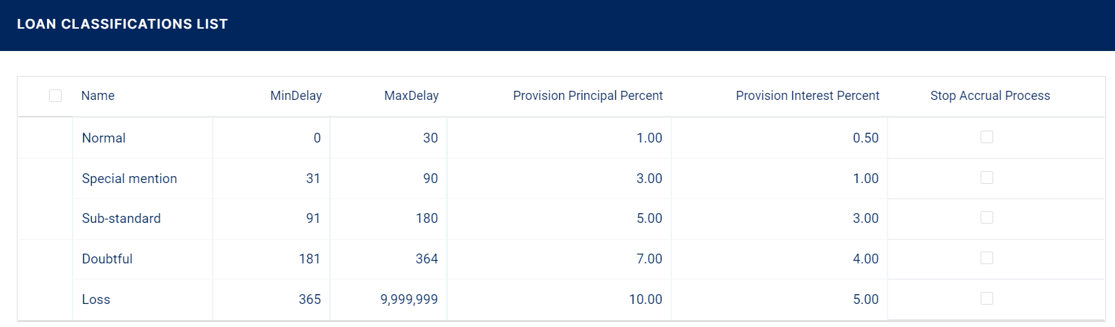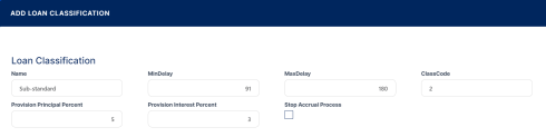 Stop Accrual Process - If you select the checkbox, then the contracts that fall within this loan classification delay category are excluded from the accrual calculation processes. If a category is marked as true, all the following categories are automatically marked as true and excepted from the accrual calculation processes.