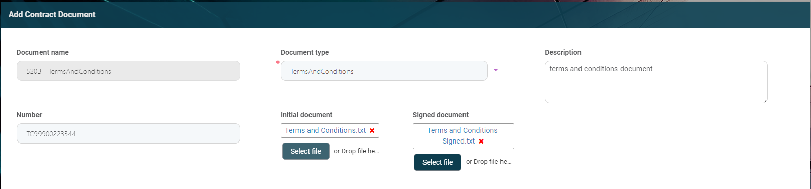 The name of the contract document record is unique, automatically generated by Core Banking. The naming convention is "the contract name + '-' + the selected document type + '-' + a unique document increment". For example,