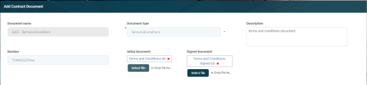 The Add Contract Document page is displayed, with the Document Name field automatically completed with the name of the document.NOTE