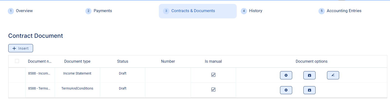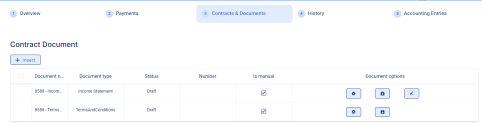 To insert a document to the contract, click the Insert button in the Contract Document section.