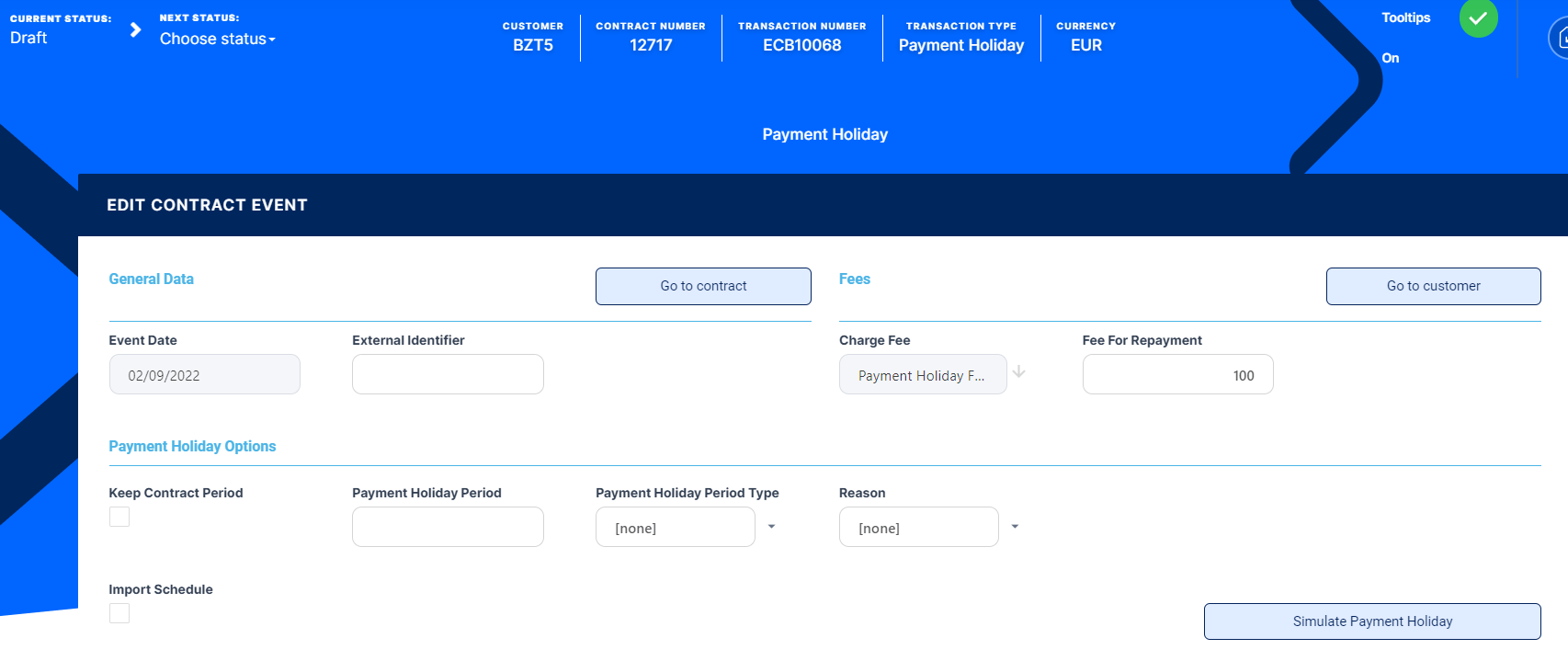 Transaction Type - Select from the list the Payment Holiday transaction type. If you can't find it, then the transaction type is not associated with the banking product which is at the base of the contract.