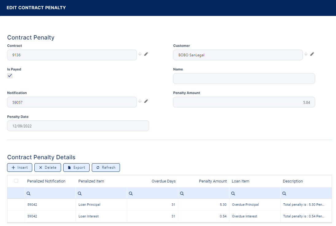 ManualPenaltyInterestListsystem parameter.Each penalty displays information about the penalized item, the penalty date, the number of penalty notification, the number of overdue days after the repayment notification's maturity date, the penalty amount, a description, and whether the penalty was pad or not.