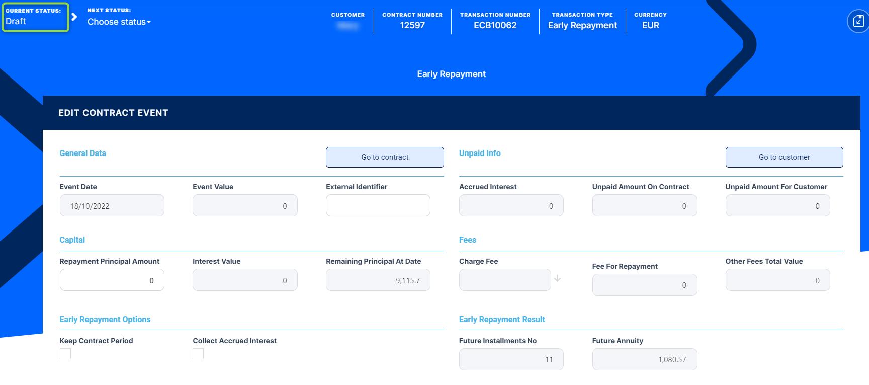 The event is saved in Draft status and a transaction number is automatically generated for it. The Edit Contract Event page corresponding to the selected transaction type is displayed. A series of value fields are automatically calculated and their values are displayed. -