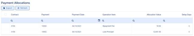 This section is empty for payments in Draft or Unallocated status. The payment allocations for due repayment notifications are automatically calculated by Core Banking and they are displayed after the record reaches the Allocated or Partially Allocated status.