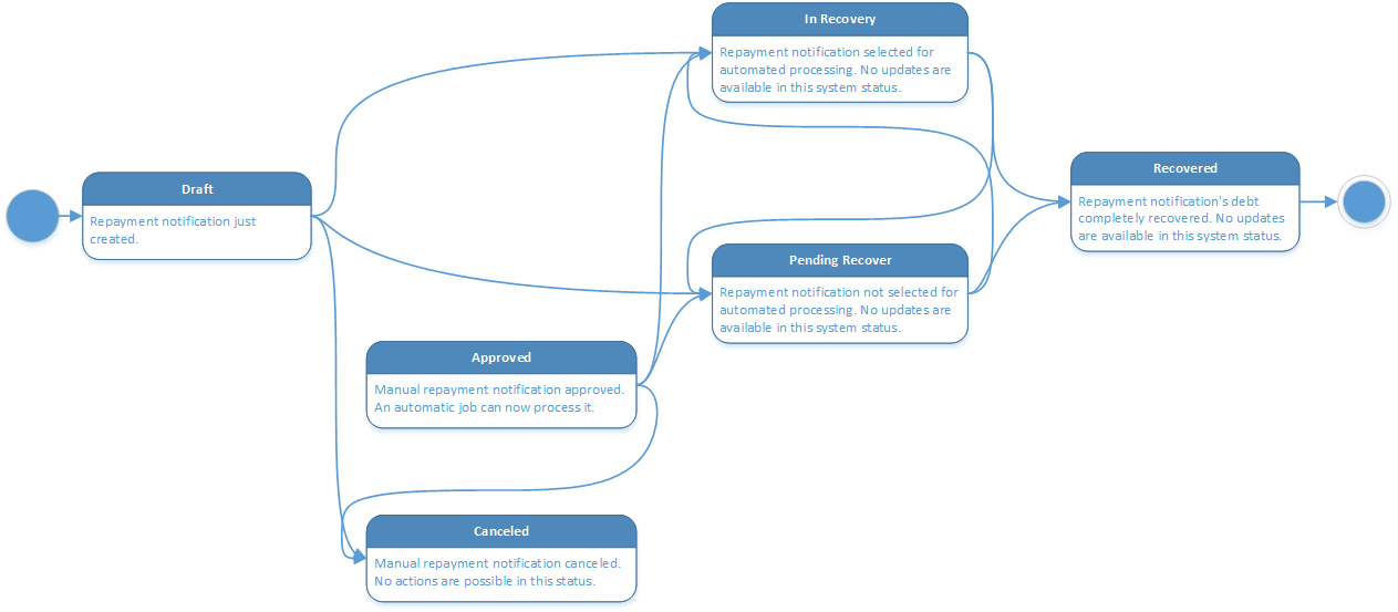 Recovered - the last status of a repayment notification, after the complete recovery of the notification's debt. No updates are allowed on the record.