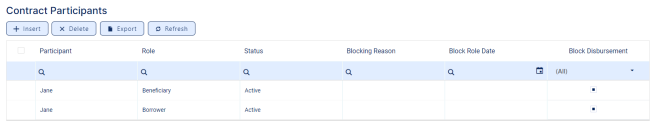 While creating a contract, Core Banking automatically populates the Contract Participants section within the Overview tab of the contract with the customer's information as both Borrower and Beneficiary of the funds, for loan contracts. If the customer is a legal entity, all the company’s already entered legal representatives such as administrators, affiliates, owners, or other key contact persons are displayed in this list. In the Contract Participants section, you can add other participants to the contract, like Guarantors, Co-Debtors, etc, even after approval, delete, block, or export customers who participate in a contract.