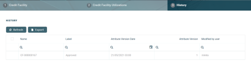 You can view the versions of the credit facility, their workflow status and the user who modified the record, in the credit facility's History tab.