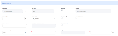 Set the customer's limits in the Limits section. If the customer is a group, then all the limits applicable for the group, coming from group members, are listed here.