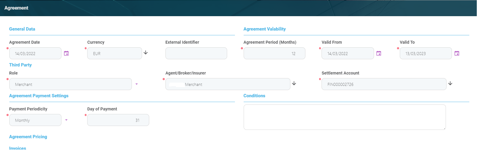 You or Core Banking's automatic process can create invoices only for agreement records with Approved status. These invoices are later used for paying out the commissions to the third-party entity and/ or the financial institution.