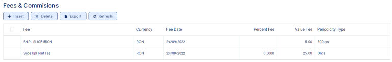In the Fees & Commissions section within the Overview tab of the contract, you can view all the fees and commissions configured at the product level that have the Automatic Load on Contract checkbox set to True. After the first saving operation, Core Banking display all the fees that are defined as values. The fees defined as percentages are displayed after completing all the values of the contract. Read more about the commissions automatically inserted and calculated in the below section. You can also add, delete or export fees and commissions for the contract.