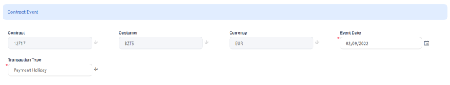 Transaction Type - Select from the list the Payment Holiday transaction type. If you can't find it, then the transaction type is not associated with the banking product which is at the base of the contract.