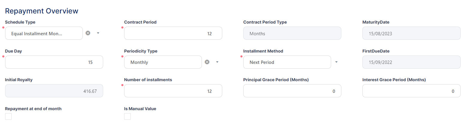 In the Repayment Overview section you should enter term, schedule type and first due date so that Core Banking can properly build the repayment schedule. Optionally you can set a grace period, mention if the due date should always be on the last day of the month and if there is any manual value for the installment.