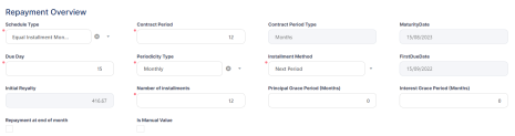 Initial Royalty - This field is automatically completed with the value of an installment. The field is displayed and can be filled in if the selected schedule type is of type