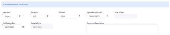 Contract - Select the number of the contract for which the notification is generated. You can choose from the approved and closed contracts of the selected customer. The currency and the source bank account are automatically filled in using the values from the selected contract. If the notification is not linked to an active contract, you must select a source bank account.