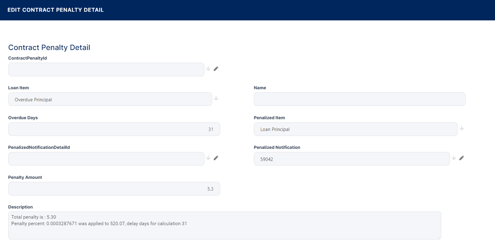 Description - The description of the contract penalty detail. It contains the total penalty value, the penalty percent or value applied to the number of overdue, and the delay days for calculation.
