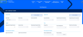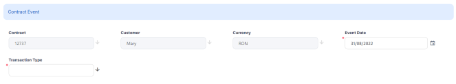 The event is saved in Draft status and a transaction number is automatically generated for it. The Edit Contract Event page corresponding to the selected transaction type is displayed. A series of value fields are automatically calculated and their values are displayed. -