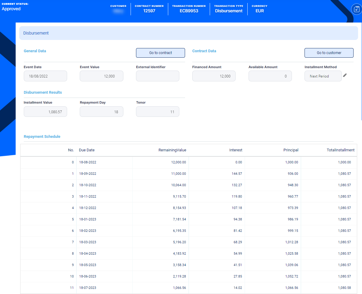 Contract transactions are events/ changes performed at the Approved contract's level. Such events are disbursements, reschedule overdues, early repayments, applying payment holidays, returning of amounts, and so on. Read more information about the available transaction types in the Transaction Types Used in Core Banking topic.