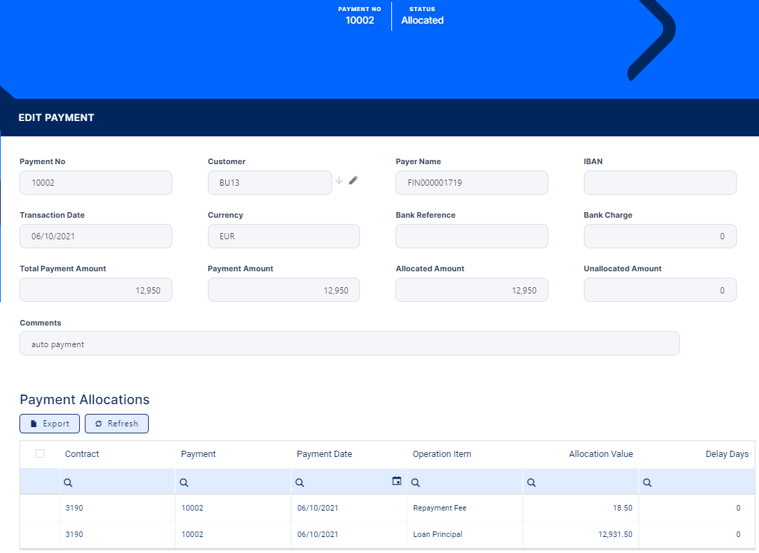 Core Banking processes payments automatically, so you can't insert payment records manually. Payment information is displayed at the contract level, within the Payments tab. For convenience, you can also view each performed payment, along with its allocation details, on the Customer Payments page.