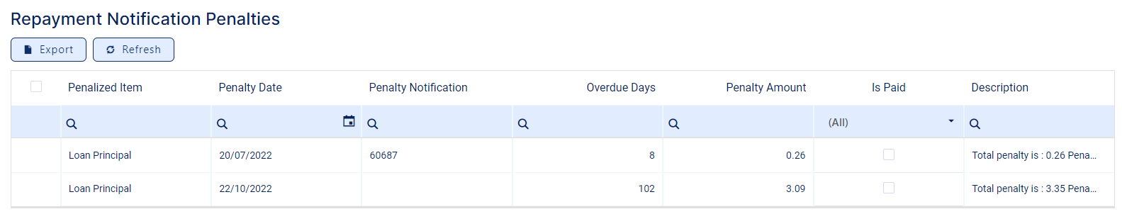 View information about the penalties calculated for the manual repayment notifications that were not paid in full until their maturity date in the Viewing Notification Penalties section: