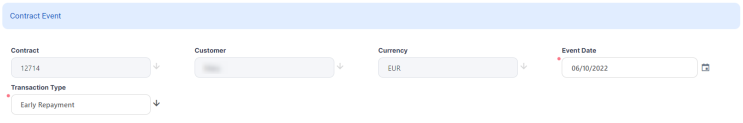 Transaction Type - Select from the list the Early Repayment transaction type. If you can't find it, then the transaction type is not associated with the banking product which is at the base of the contract.