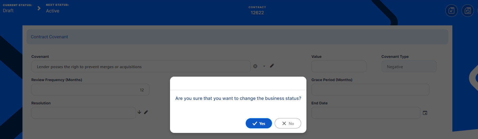 If the covenant's terms are met, change the covenant's status to Active and confirm your action.