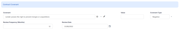 Lender posses the right to prevent merges or acquisitions: a clear stipulation that the lender possesses the right to prevent merges of acquisitions without proper notification or full knowledge of the process. This covenant is of type negative.Core Banking automatically fills in the covenant type.