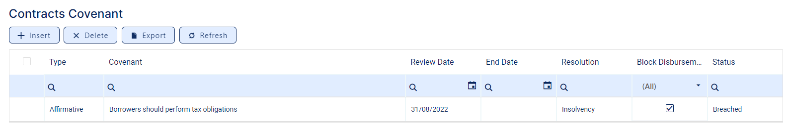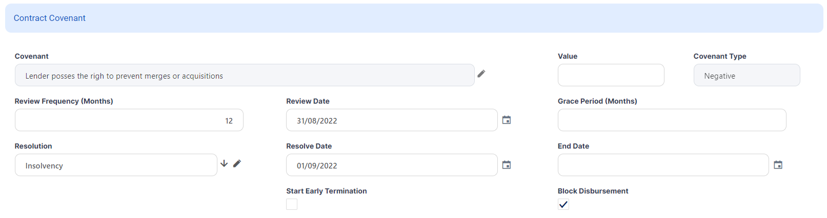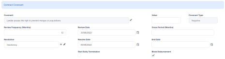 Block Disbursement - If the covenant's terms are not met, then you can check this field to mark the covenant for blocking further disbursements of the contract.