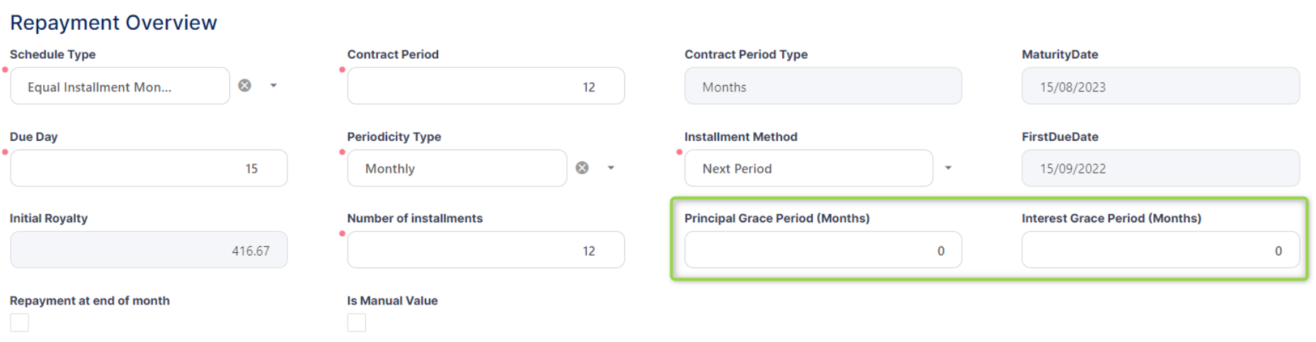 The loan grace setting are exposed at contract definition level for you to customize according to the customer's needs, within the Repayment Overview section: