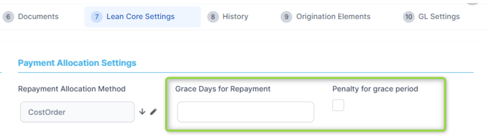 Installment grace - This is when you set a number of days allowed for the borrower to settle their notified amounts. Suppose the contract's schedule has its due date every month on the 15th and you want to allow for 5 days for the amounts to be recovered. If the amounts are not recovered in the 5 days, you also have the option to recalculate the penalty interest, if such interests exist on the contract, starting from the initial due date of 15th, or start applying it starting from 20th of the month. This one does not have an impact on the schedule projection, but on how and when to consider the amounts as overdue, and it relates to the notifications processing. These settings must be set at the banking product level, within the Lean Core Settings' tab Payment Allocation Settings section, as described in the in the Banking Product Factory user guide.