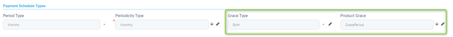 Loan grace - This is negotiated as part of the approval of a loan contract and is granted at the beginning of the loan, for a given number of installments during which the borrower pays only interest or nothing at all. This one has an impact on the schedule projection. Set the loan grace at the banking product definition level, in the Details tab's Payment Schedule Types section, as described in the Banking Product Factory user guide.