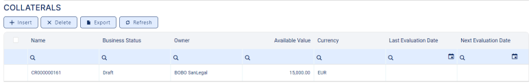 Manage the customer’s registered collaterals in the Collaterals section, displaying details such as name, business status, owner, available value, currency, last and next evaluation dates.