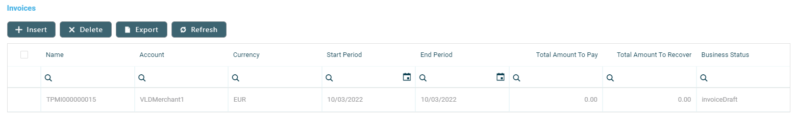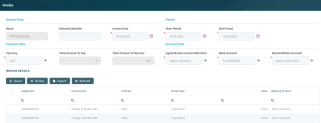 The section displays information about the invoice: name, third-party, currency, start and end period, total amount to pay to the third-party and to recover by the financial institution, record's business status.