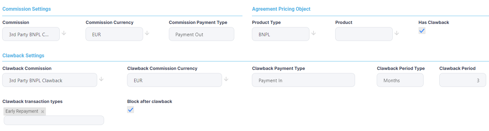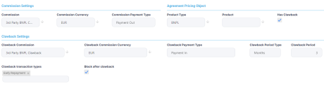 For a setup like the above, if all the conditions are met and a contract for a Buy Now Pay Later product type is included in the invoice for the agreement and if an Early Repayment transaction is performed within the first 3 months from creating the contract/ generating the initial commission, then Core Banking triggers the clawback automatically.