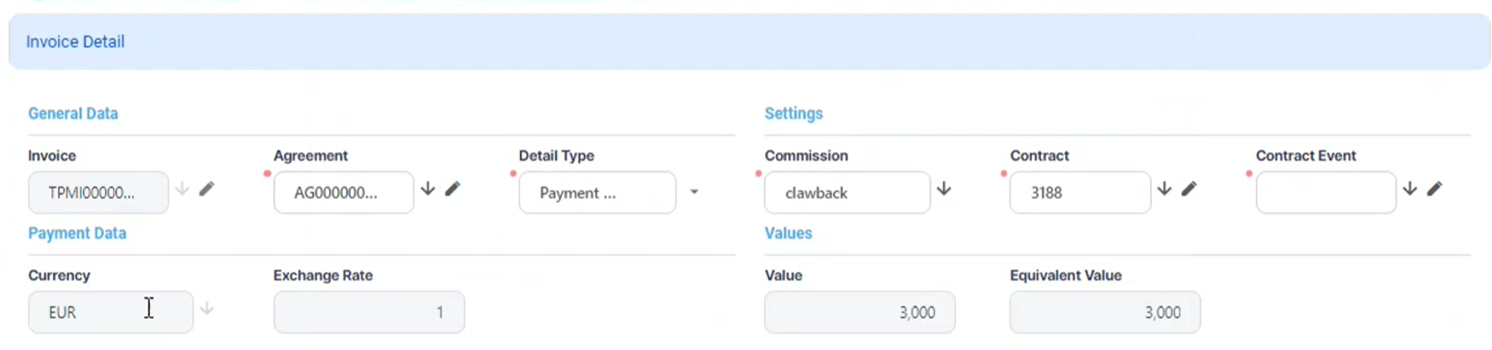 Contract - Select the contract that is the object of the invoice detail. You can only choose from the list of contracts with the third-party having the role specified in the selected agreement, and having the activation date during the period of the invoice, for commissions with