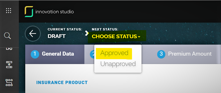When you finished filling in the data, you must activate your product from the header option set. Product status determines if your insurance product is used in digital journeys targeting potential customers. In order to make it available for different digital journeys, the product should be in the Approved status. For details, see the Product Life Cycle page.