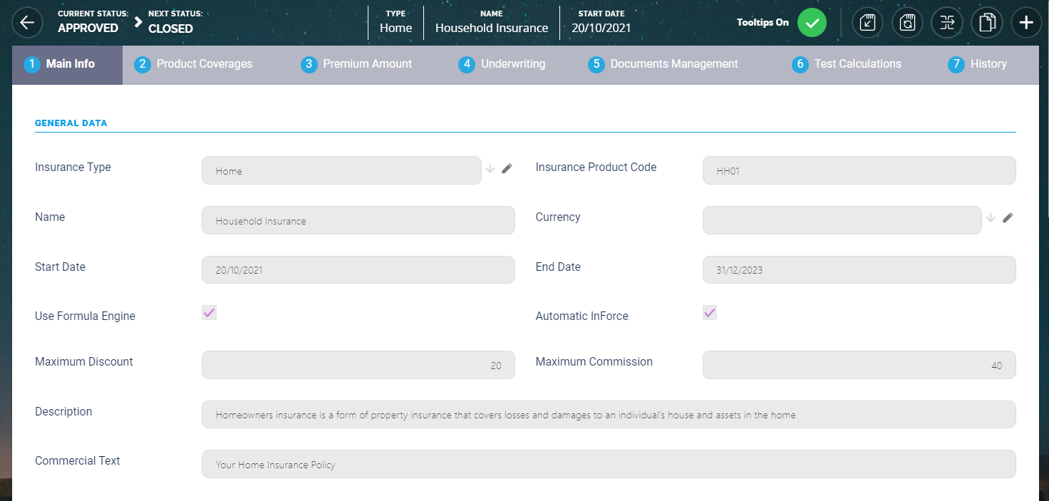 At the top right corner of the Insurance Products List page, click Insert to add a new insurance product. The Insurance Product dynamic form opens. This form allows you to create your desired product and configure the product settings. To complete the creation journey for your product, go through all the tabs listed below. Filling in information in the first tab activates the next tabs and lets you move forward through the product creation journey. However, if you need to interrupt your journey, you can use the Save and close button to save your product as Draft, and complete the journey at a later time. While the product is in Draft business status, the form is still editable. For more details, see the Creating a Draft Insurance Product section, from the Product Lifecycle page.