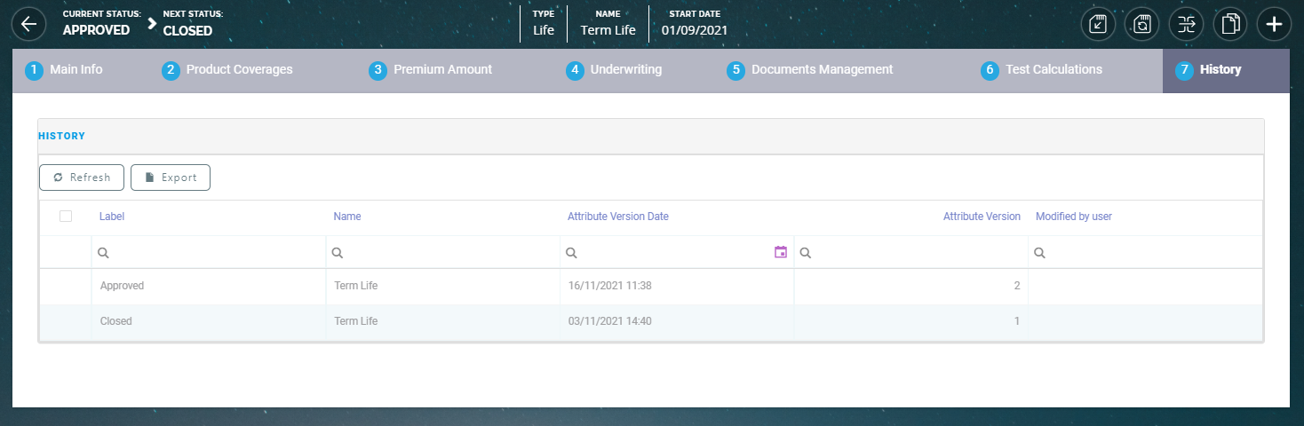A history of the product allows you to understand how your product evolved over time and decide on updating its course, eventually. You go to the History tab when you need to have an overview over the product's life cycle, inform yourself about previous product versions (approved or unapproved), their workflow status, or to obtain details about users who modified the product.
