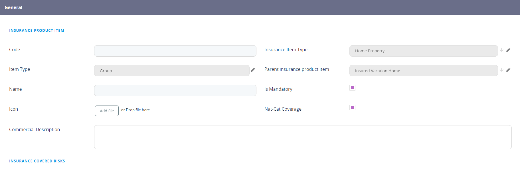 | Nat-Cat coverage | Check the box if the risk item belongs to the Natural Catastrophes group. |