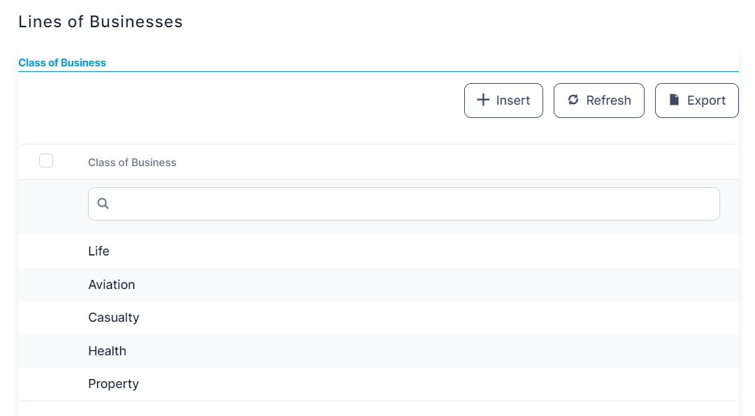 Class of Business - Eg.: Property, Casualty, Life, Health;