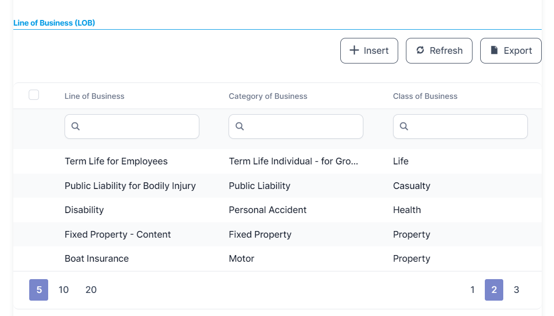 In many countries, insurers must register their Lines of Businesses (LOBs) with their insurance supervisory authority and make insurance offers according to their authorized LOBs. A Line Of Business (LOB) is a general classification of business used by the insurance industry. It has a regulatory and accounting definition - such as Fire, Motor, Personal Accident, or General Third Party Liability, and meets a rather rigidly defined set of insurance policies. Consequently, insurers cannot establish policies outside the scope of their registered LOB. Besides that, some insurance companies might have multiple authorized LOBs, depending on how many types of insurance they want to sell.