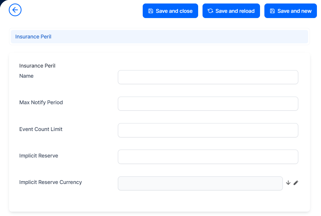 On the Insurance Perils List page, click Insert, at the top right corner of the page. The Insurance Peril form opens.