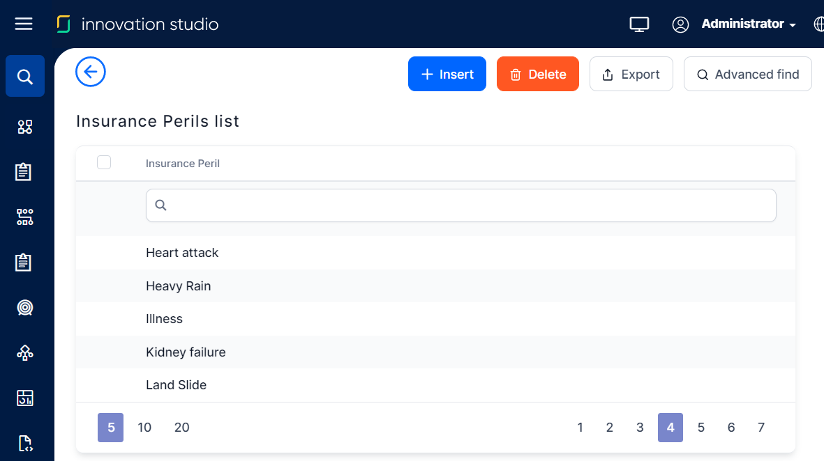 In Innovation Studio, in the Insurance Perils/ Conditions section, you have an overview of all the insurance perils registered in your system - your nomenclature of perils, or conditions. This is an all-inclusive view; yet, you can also use the Search option in order to find a specific peril record.
