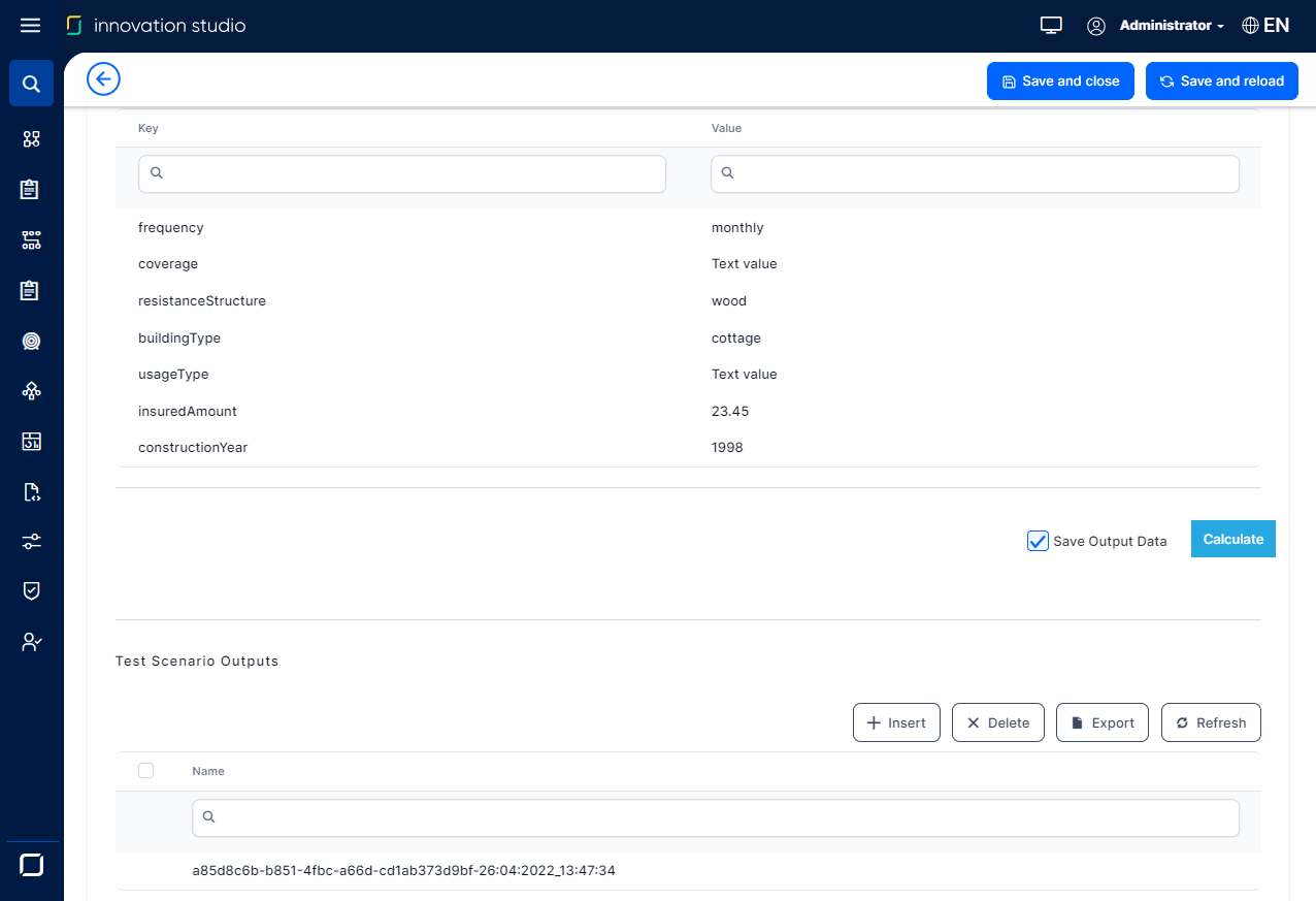 Below, an example of the insurance test scenario insert form, with the Calculate and Save the Output Data buttons, available after Save and reload: