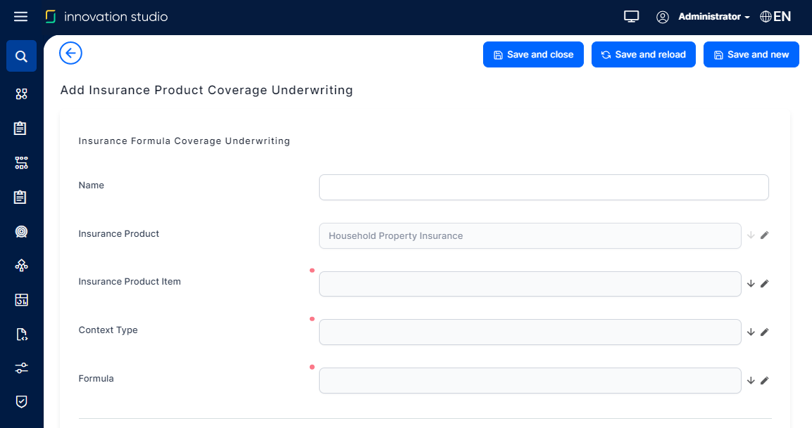 Prerequisite: You must have previously selected the Per Product underwriting type, in the Main Info product tab. This selection makes the Add Insurance Formula Underwriting insert form available in the Underwriting tab.