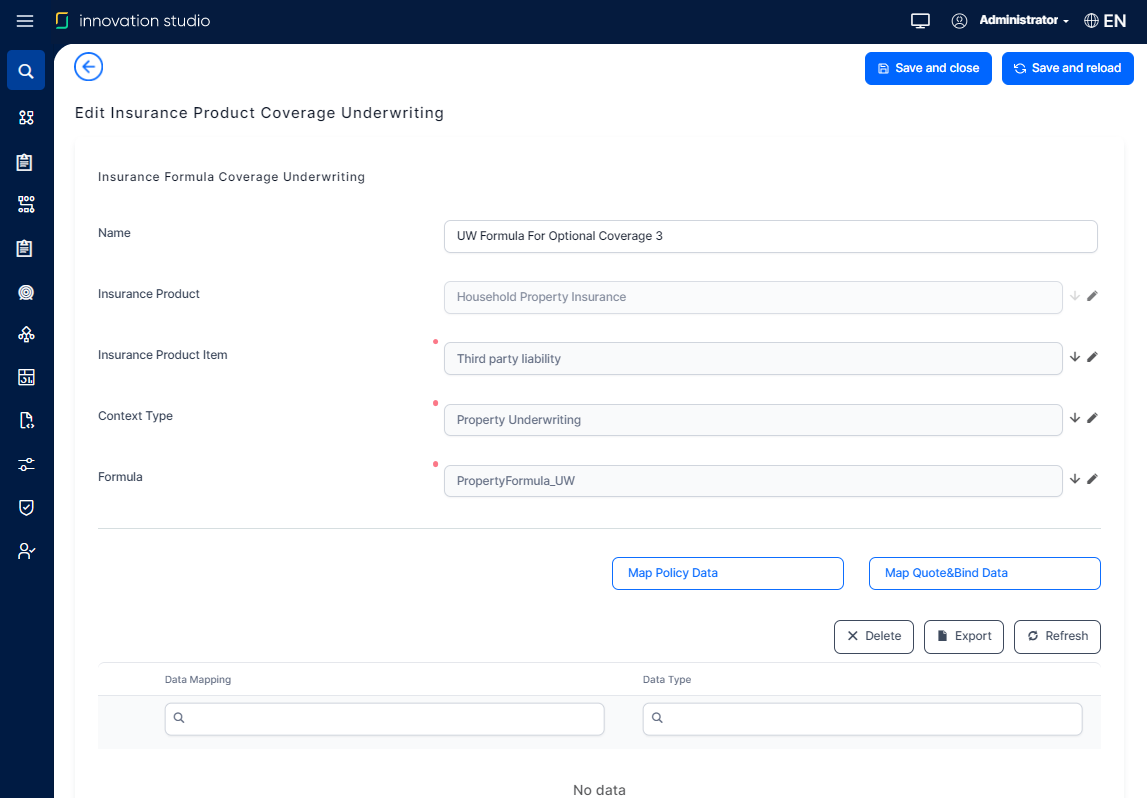 Below, an example of the insert form for a coverage UW formula - with Map Data buttons available, after save and reload: