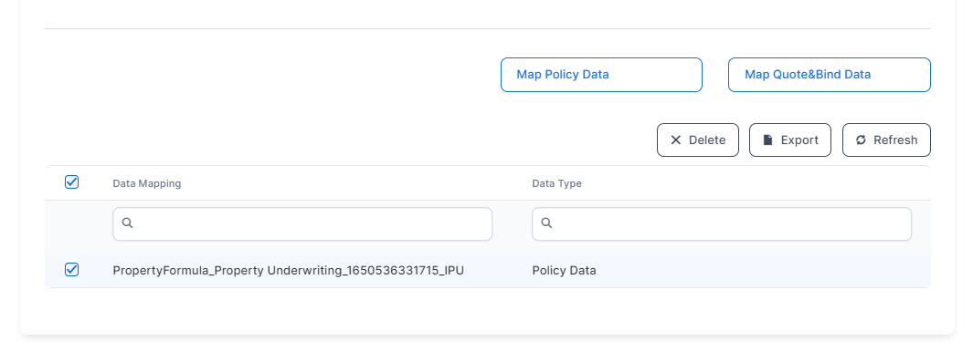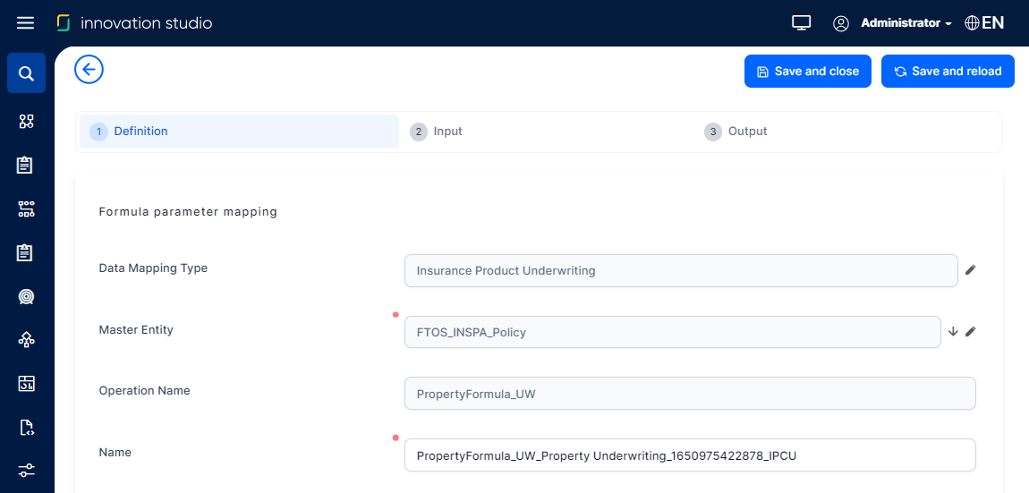 These buttons allow you to define a single data mapping, for either a Policy Admin or a Quote and Bind flow. When clicking either of the buttons, you can select a Master Entity (any master entity that you need, for your calculations). This way, you get access to use the values of the selected entity's attributes as formula input keys, to obtain a certain output (and this output is registered on some other entity).