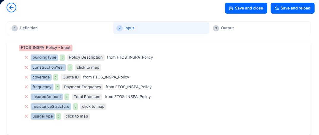 Go to the Input tab (second tab) and use the Click to Map buttons, next to each formula input key (in blue), in order to indicate the attribute (belonging to the previously chosen master entity) from which the system will extract the value needed for calculation.
