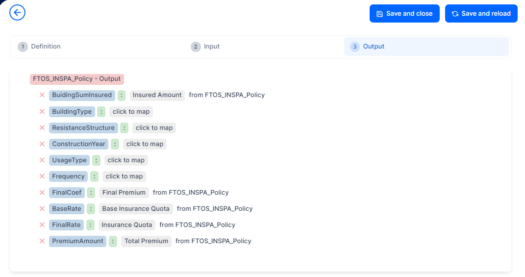 Go to the Output tab (third tab) and use the Click to Map buttons, next to each formula output key (in blue), in order to indicate the attribute to which the system will make updates (insert the value obtained) after the calculation.