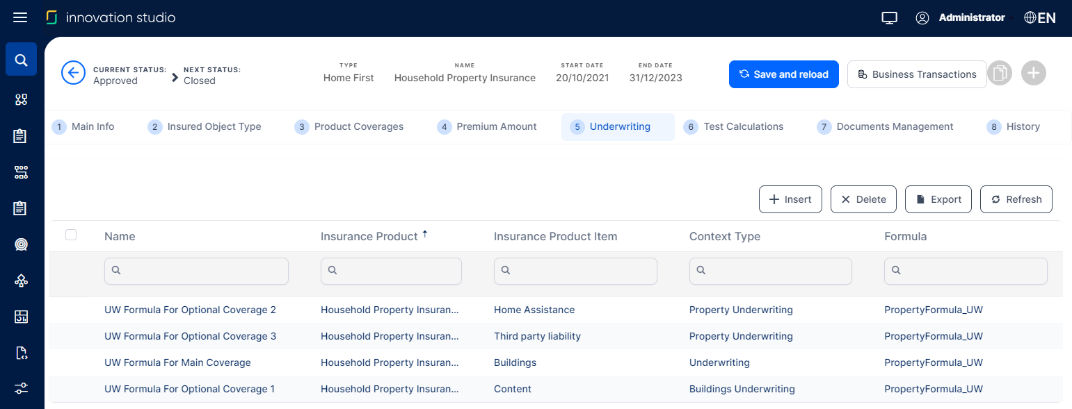 Below, an example of an insurance product with formulas for underwriting attached to its coverages (insurance product items):