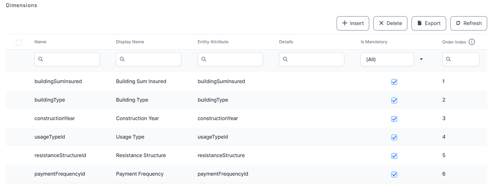 In the Dimensions grid, click Insert to add a new dimension for the insured object. The dimension editor is displayed.